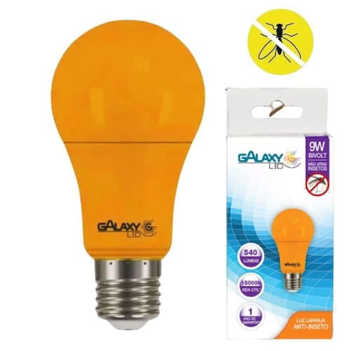 Lâmpada Led Anti-inseto Galaxy 9w - 1000k Luz Laranja Código: 1260 Potência: 9 W Base: E27 Tensão: 100~240 V Temperatura de Cor: 1000K Ângulo de Abertura: 200 Frequência Nominal: 50/60Hz Fluxo Luminoso: 840 lm Lúmens: 540 Fator de Potência:>0,5 Corrente Nominal: 127V - 70 mA / 220V - 40mA Peso: 50g Vida Útil (L70): 15000h Garantia: 1 ano A imagem do produto é ilustrativa e pode variar de tonalidade e cor de acordo com a configuração de cada monitor. Os objetos que compõem a foto ambientada não acompanham o produto. Fotos meramente ilustrativas. Marca: GALAXY CONCEPT