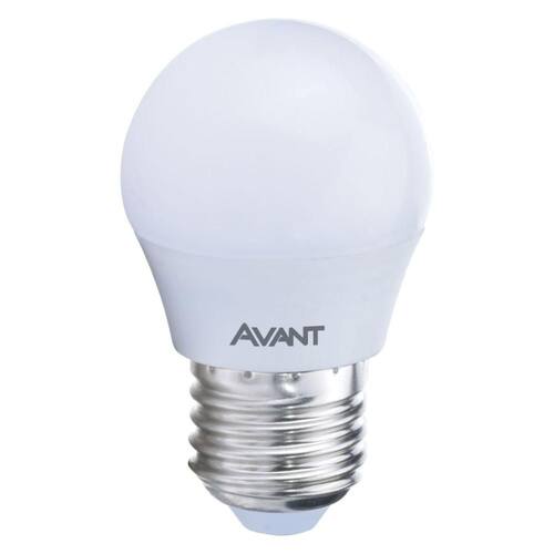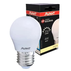 - Marca: Avant; - Referência: 285180350; - Corpo e difusor em policarbonato; - Potência: 4W; - Temperatura da Cor: 4000K; - Fluxo luminoso: 350 lm; - Eficiência luminosa: 88 lm/W; - Tensão: Bivolt; - Base: E27; - Índice de Proteção: IP20; - IRC: >70; - Fator de potência: >0,50; - Possui driver interno isolado; - Baixo consumo de energia; - Temperatura ambiente: -5C a 40C; - Não dimerizável; - Ângulo de abertura: 200; - Uso interno; - Vida útil: 25 mil horas; - Garantia: 1 ano.