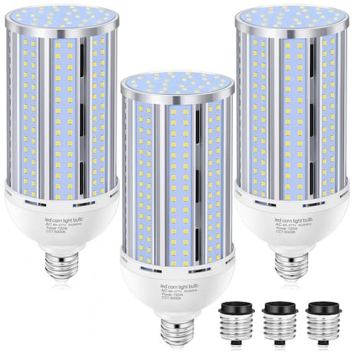 O conjunto de 3 lâmpadas LED Corn de 120W, equivalentes a 1200W, com base E26/E39, temperatura de cor 5000K daylight e 15.800 lumens, é ideal para iluminação interna e externa em garagens, galpões, fábricas, oficinas, ruas e quintais. Estas lâmpadas possuem tecnologia fanless, garantindo funcionamento silencioso e maior durabilidade. Com ângulo de abertura de 360°, oferecem iluminação uniforme e eficiente, substituindo lâmpadas tradicionais como vapor metálico e fluorescentes. São fáceis de instalar em soquetes padrão, economizam energia e proporcionam luz branca natural ideal para ambientes de trabalho e segurança. O peso de envio fica por volta de 1,6 kg para o kit com 3 unidades, com embalagem adequada para transporte seguro.