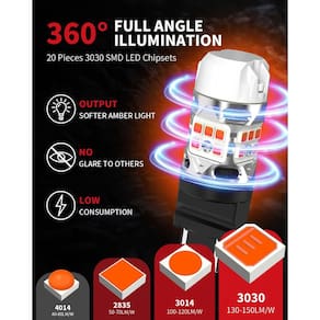 LASFIT Lâmpada LED 3157 âmbar, T3 4157 3057 seta Resistor embutido CANBUS Luz dianteira traseira atualizada sem erros 3457 3047 3357 4057 3056 3456 4156, apenas para soquete padrão, pacote com 2 - 500% mais brilhante que o halogênio: as lâmpadas de seta LASFIT T3 3156 3157 são impressionantes 500% mais brilhantes do que as lâmpadas de halogêneo. Equipado com 20 chips de LED 3030 de alta qualidade, eles proporcionam um efeito de iluminação total de 360°. Cada lâmpada oferece 4000 lúmens e 48 watts de iluminação âmbar para seta. O brilho é medido com precisão, garantindo uma experiência de condução visualmente atraente com cores vibrantes. - 99% livre de erros Canbus: as lâmpadas LED LASFIT 3156 3157 são projetadas para integrar perfeitamente com 99% dos sistemas de computador do veículo, graças ao seu resistor integrado atualizado. Após testes extensivos, a LASFIT eliminou a necessidade de resistores adicionais, fornecendo uma solução de seta verdadeiramente avançada. Diga adeus ao hiper piscar e desfrute de uma experiência de condução sem preocupações. - Vida útil de 30.000 horas: as lâmpadas LED âmbar 3157 apresentam um sistema de controle de temperatura inteligente (ITCS), garantindo um desempenho ideal mesmo em dias escaldantes. Eles são projetados com uma estrutura de alumínio que tem um acabamento texturizado para maior dissipação de calor. Além disso, as aletas internas do filtro de calor fornecem resfriamento adicional, garantindo um desempenho confiável. - 5 minutos, fácil de instalar: substitua suas lâmpadas de seta em apenas 5 minutos sem necessidade de modificações e sem necessidade de decodificador extra. As lâmpadas LED LASFIT 3157 são projetadas para encaixar perfeitamente nos soquetes de lâmpada de halogênio Autêntico, garantindo um ajuste perfeito em sua caixa. Compatível com soquetes padrão para luzes de seta dianteiras ou traseiras, incluindo modelos 3056, 3456, 4156, 3047, 3057, 3155, 3357, 3454, 3457, 4057, 4157, 3757, 3057A e 3357NA. - Dicas quentes: Estas lâmpadas âmbar 3157 3156 são sensíveis à polaridade. Se a lâmpada LED não acender após a inserção, basta removê-la, virar a direção e reinstalar.
