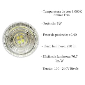 Nós da acende a luz procuramos trazer o que há de mais atual e moderno no mundo da iluminação priorizando sempre a qualidade. Procuramos não apenas atender às suas necessidades, mas superar expectativas. Assim estabelecendo uma relação de confiançaNossa missão é garantir a satisfação total dos nossos clientes.Lâmpada led mini dicroica mr11 gu10 3w 6000k branco frio- base: gu10- formato: mr11- temperatura de cor: 6000k branco frio- tensão: bivolt- potência: 3w- fator de potência: 0.40- fluxo luminoso: 230 lm- eficiência luminosa: 76,7 lm/w- ângulo de abertura: 38- vida útil : 25.000 horas- temp. De operação: -20c 40c- frequência: 50/60hz