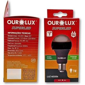Lâmpada Led Ourolux Luz Negra Bulbo 7w E27 Bivolt 110V/220V Lâmpada Led Ourolux Luz Negra Bulbo 7w E27 Bivolt 110V/220V Descrição do Produto Transforme seu ambiente com a Lâmpada Luz Negra LED de 7W Perfeita para festas, eventos e ambientes criativos, esta lâmpada traz um efeito especial que destaca cores fluorescentes, criando uma atmosfera vibrante e envolvente. Destaques do Produto - Potência: 7W, ideal para iluminar com eficiência sem gastar muito. - Bivolt: Funciona em diferentes voltagens, garantindo versatilidade na instalação. - Efeito Neon: Realça elementos fluorescentes, perfeito para decorações temáticas e festas. - Tecnologia LED: Baixo consumo de energia e longa durabilidade, reduzindo a necessidade de trocas frequentes. - Fácil Instalação: Compatível com soquetes E27 padrão, basta substituir sua lâmpada convencional. - : 3 meses - Tamanho do Produto: 11cm altura x 5cm largura. - Modelo: Bulbo - Composição: Polímero termoplástico e componentes eletrônicos Seja para criar um ambiente descontraído em uma festa ou para dar um toque diferente à sua decoração, a Lâmpada Luz Negra LED 7W é a escolha ideal. Não perca a chance de impressionar seus convidados Marca: Não Informado Ean: 7899771507831