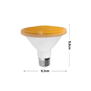 Lâmpada Par30 Led 10W Bivolt Luz Ambar, IP65 E27 Luminatti. Seu acabamento refletor enfatiza o brilho da luz, o distribuindo de forma suave e uniforme. Ideais tanto para ambientes internos como externos, já que as lâmpadas estão protegidas de jatos de água e poeira, com Índice de Proteção 65 (IP 65).