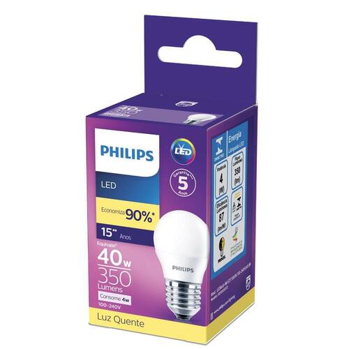 Lâmpada Led Philips Bolinha 4W bivolt base E27 (escolher a cor da luz no momento da compra)Garantia: 5 anosCaracterísticas da lâmpada:- Formato - G45 (bolinha)- Base/encaixe - E27- Não dimerizável- Voltagem - Bivolt 100 - 240 V- Potência em watts - 4W- Equivalente em Watts - 40 WCaracterísticas da luz:- Emissão de luz - 350 lumens- Índice de reprodução de cor (CRI) - 80- Vida útil: 15.000 horas Escolha a iluminação LED certaAs luzes LED da Philips estão disponíveis numa variedade de formas e tamanhos. As nossas lâmpadas utilizam até 80% menos energia do que as lâmpadas convencionais. Fornecem uma qualidade de luz consistente ao longo do tempo e têm longa duração.Luz branca suaveCrie um ambiente quente e acolhedor com iluminação LED.Energeticamente eficienteDuração mais longa e consumo de até 90% menos de energia do que as fontes de luz tradicionaisqualidade de luz led. Qualidade de luzDesfrute de uma qualidade de luz perfeita, com arranque imediato e sem período de aquecimentolâmpadas led reguláveis Intensidade regulávelCrie a atmosfera certa com iluminação LED regulável.