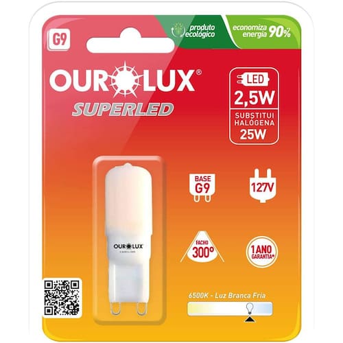 Lampada led superled base g9 2,5w 6500k ourolux Apropriada para utilização em lustres, arandelas decorativas e luminárias de tamanhos pequenos. Com economia de energia de até 90%, é ideal para aplicações em ambientes comerciais e residenciais.