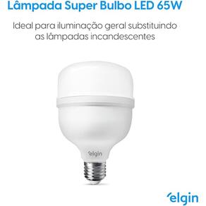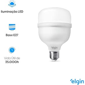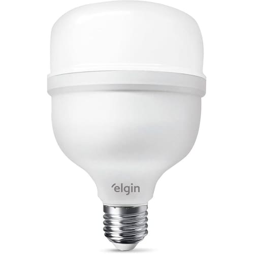 LAMPADA LED, TIPO BULBO T, COM DISPOSITIVO DE CONTROLE INCORPORADO A BASE, EMBALAGEM: CAIXA PAPELÃO COLORIDO, MATERIAL EMPREGADO: PLASTICO PC, LED, ALUMINIO E OUTROS COMPONENTES ELETRÔNICOS, POTENCIA 30W, TENSÃO 100-240V, FLUXO LUMINOSO 2400LM, EFICIÊNCIA LUMINOSA 80LM/W, TEMP DE COR 6500K, BASE E27. MARCA: ELGIN.