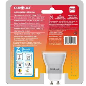 Lâmpada Superled Mr16 Gu10 De 4 Watts E 2700k - 20077 - Ourolux Lâmpada Superled Gu10 4w Bivolts 2700k - 20077 - Ourolux Lâmpada Superled MR16 Gu10 de 4 Watts e 2700K - 20077 - OUROLUX Descrição: A linha SUPERLED Dicróica no modelo GU10 proporciona a mais adequada iluminação, pois os produtos podem ser utilizados em ambientes residenciais e comerciais, como decoração de vitrines, obras de arte, objetos de decoração e plantas, que podem ser destacadas sem que sejam danificadas.
