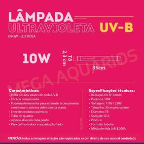 Lâmpada ultravioleta B, UV-B, grow, luz rosa de 10W tubular fluorescente para cultivo de plantas e aquário plantado Nossas lâmpadas UV-B foram desenvolvidas com tecnologia de ponta para garantir a mais alta qualidade e eficiência para substituir os raios solares e seus efeitos no cultivo de plantas. Atenção Leia atentamente o anúncio antes da compra, siga as orientações de uso. A exposição de luzes UV-B pode causar vermelhidão e queimaduras de pele. Principais Características: Tubular de 4 pinos 2 pinos em cada ponta Imita os raios solares de onda UV-B Eficácia comprovada no desenvolvimento de plantas A lâmpada UV-B luz rosa é uma poderosa ferramenta para estimular o crescimento de plantas, tanto no cultivo indoor como em aquário plantado Ideal também para melhorar o sistema defensivo da planta Livre de produtos químicos, a luz UV-B não deixa resíduos tóxicos no ambiente, no ar ou na água Tubo de quartzo Necessita de reator próprio para lâmpada UV Evite de expor a pele e olhos por muito tempo à radiação da lâmpada Caso precise ficar por muito tempo próximo a luz emitida pela lâmpada, é recomendado o uso de protetor solar Entrega rápida para todo país. Aplicação - Para que serve a lâmpada ultravioleta - UV-B grow: Estimular o crescimento de plantas em cultivo indoor e em aquário plantado Em aquário de água doce, ela realça as cores dos peixes Como a luz UVB funciona para as plantas: Auxilia o processo de fotossíntese, reduz a biomassa, a altura e a área foliar das plantas, mas aumenta a espessura das folhas, o terpeno e a produção de resina. Especificações técnicas: Marca: Lucmat, Ilumisampa, Jad, Boyu ou Aquam conforme disponibilidade em Modelo: Lâmpada UV UV-B grow fluorescente ultravioleta B 10W Radiação: Emite radiação UV de onda média 280-320nm UV-B Potência: 10W Voltagem: 110V / 220V pode ser ligada nas duas voltagens conforme ligação do reator Tamanho: 35cm Largura: T8 - 2,3cm Soquete: G13 Pinos: 4 Formato: tubular Média de vida útil: 8.000h Necessita reator específico para lâmpada UV de 10W. A lâmpada UV-B também pode ser conhecida como: Lâmpada UV-B, UVB, lâmpada ultravioleta B, lâmpada rosa, lâmpada de luz rosada, grow, growth, grow-lux, grow light. Como usar a lâmpada UV-B grow para o cultivo de plantas: Para a instalação é necessário a utilização de um reator próprio para lâmpada UV da mesma potência da lâmpada, posicionar a lâmpada de 5 a 10cm das plantas. Como descartar lâmpadas UV corretamente: Procure pontos apropriados de coletas específicos para materiais reciclados como lâmpadas e resíduos eletrônicos. Nunca jogue lâmpadas tubulares no lixo comum, pois elas contêm metais pesados e outros materiais perigosos. IMPORTANTE Evite de expor a pele e olhos por muito tempo à radiação da lâmpada Caso precise ficar por muito tempo próximo a luz emitida pela lâmpada, é recomendado o uso de protetor solar A lâmpada tem Sim, para defeito de fabricação de 90 dias. A não se aplica para uso indevido do produto e instalação inadequada. Precisa de reator Sim, precisa de reator específico para lâmpadas ultravioletas. Posso colocar diretamente na água Não, é necessário o uso de equipamento próprio como luminárias ou calhas. Serve para desenvolvimento de corais Para corais, o mais indicado é a lâmpada UV-A ou também conhecida como lâmpada actínica Obrigado pela visita e boas compras ATENÇÃO Nossas imagens e textos são registrados e com direito de uso autoral controlado e reservado a essa loja e as lojas parceiras devidamente autorizadas em contrato.