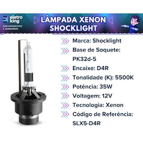 • Marca: Shocklight • Base de Soquete: PK32d-5 • Encaixe: D4R • Tonalidade (K): 5500K • Potência: 35W • Voltagem: 12V • Tecnologia: Xenon • Luz de Alta Intensidade • Proporciona Maior Economia e Qualidade • Código de Referência: SLX5-D4R