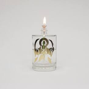 Especificações: 5,5 cm de diâmetro. Material Lamparina: Vidro de aproximadamente uma espessura de 3mm. Pintura do Anjo em dourado similar ao folhado a ouro. Pavio: Vidro eterno Sem Cheiro Marca: Velas Bistrot Classificação de risco do óleo não incluso : 1 Não inflamável Consumo de fluido: De 40 à 85ml a cada 10 horas, dependendo da regulagem da altura da chama.