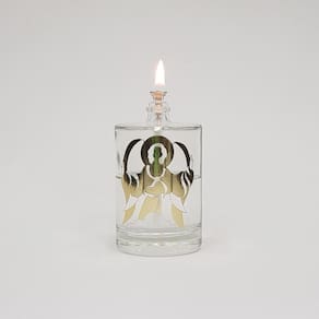 Especificações: 5,5 cm de diâmetro. Material Lamparina: Vidro de aproximadamente uma espessura de 3mm. Pintura do Anjo em dourado similar ao folhado a ouro. Pavio: Vidro eterno Sem Cheiro Marca: Velas Bistrot Classificação de risco do óleo não incluso : 1 Não inflamável Consumo de fluido: De 40 à 85ml a cada 10 horas, dependendo da regulagem da altura da chama.