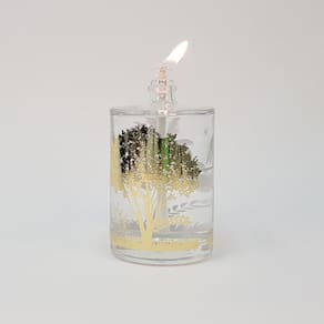 Especificações: 5,5 cm de diâmetro. Material Lamparina: Vidro de aproximadamente uma espessura de 3mm Pintura da floresta em dourado que imita o folhado a ouro Detalhes: Marmorizados imitam o folhado a ouro Pavio: Vidro eterno Sem Cheiro Marca: Velas Bistrot Classificação de risco do óleo não incluso : 1 Não inflamável