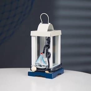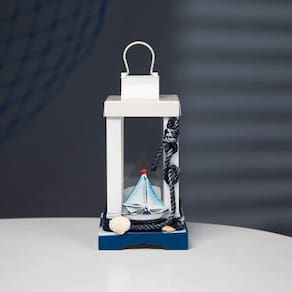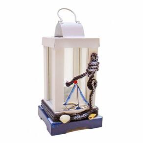 Especificações: Cor: Branco e Azul Medidas: Altura 19cm, Largura 9,5cm Material: Alumínio e Madeira Função: Luminária Modelo: Naval