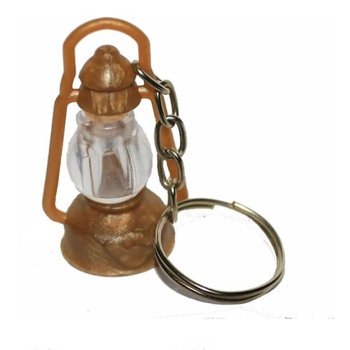 Recipiente porta óleo de unção, em formato de lamparina, sendo que contém um tampa para não vazar o óleo, que também é um chaveiro.