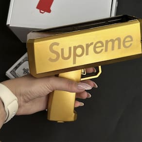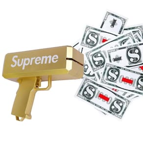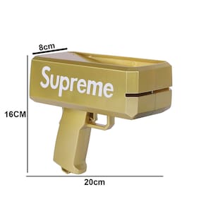 Transforme qualquer festa em palco de surpresa com este divertido e estiloso Lançador. Em acabamento dourado metálico com a palavra “Supreme”, ela dispara dinheiros falsos ou verdadeiros (vêm inclusas cédulas falsas) para um efeito espetacular em aniversários, casamentos, formaturas, festas temáticas e gravações de vídeo.