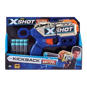 O X-Shot Kickback Royale Edition é um lançador que possui potência suficiente para atingir alvos a 27 metros de distância! Na verdade, ele tem tanto poder que realmente retrocede quando disparado! Ele vem com um revestimento de ouro cromado para que você se destaque nas brincadeiras. Acompanha 8 dardos de espuma. O lançador é compatível com os principais dardos do mercado. A brincadeira será muito mais divertida com o X-Shot Kickback Royale Edition!