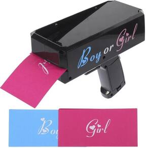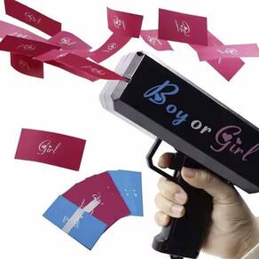 Lançador de Revelação do sexo do bebê, você pode anunciar de forma divertida e criativa se vem aí um menininho ou uma menininha! Basta adicionar as notas azul para menino ou rosa para menina, e apertar o gatilho! Seus convidados vão à loucura!