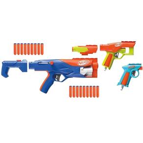 O kit Nerf N Series Gear Up Pack inclui 3 lançadores diferentes e 2 acessórios para criar 10 estilos diferentes.