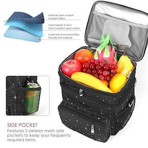 Lancheira para mulheres e homens, lancheira de dois andares – à prova de vazamento isolada macia grande adulto lancheira térmica para trabalho, MIYCOO (céu estrelado preto, 15 L) lancheira de camada dupla de grande capacidade Mede 25,7 cm x 19,6 cm x 23,1 cm. Tamanho expandido: 25,7 cm x 19,6 cm x 26,2 cm. Diferentes alimentos podem ser colocados nas camadas superior e inferior para evitar que os alimentos sejam empilhados e espremidos. A lancheira de grande capacidade pode guardar facilmente todas as suas cerveja, lanches, bebidas, sanduíches, frutas, lancheiras. Multifuncional. Você pode levá-la para piqueniques nos fins de semana, levar almoço e lanches para o escritório, levar cerveja gelada para as praias e também pode ser usada como uma bolsa casual. Adequado para homens e mulheres. Forro de PEVA espesso à prova de vazamento e isolamento sem emenda para evitar vazamentos. O forro interno é feito de material de isolamento térmico, que pode manter a comida quente ou fria e também pode colocar cubos de gelo. O forro de PEVA fácil de limpar é suave e fácil de limpar. Você pode colocar os utensílios de mesa utilizados sem se preocupar com a limpeza. Armazenamento de longo prazo Os cubos de gelo podem ser colocados na lancheira para manter a temperatura e o frescor de alimentos e bebidas por pelo menos 7 horas. - Lancheira de camada dupla de grande capacidade: mede 25,7 cm x 19,6 cm x 23 cm. Tamanho expandido: 25,7 cm x 19,6 cm x 26,2 cm. Diferentes alimentos podem ser colocados nas camadas superior e inferior para evitar que os alimentos sejam empilhados e espremidos. A lancheira de grande capacidade pode guardar facilmente toda a sua cerveja, lanches, bebidas, sanduíches, frutas, lancheiras - Multifuncional: você pode levá-la para piqueniques nos fins de semana, levar almoço e lanches para o escritório, levar cerveja gelada para as praias e também pode ser usada como uma bolsa casual. Adequado para homens e mulheres - À prova de vazamento e isolamento: forro de PEVA espesso sem emenda para evitar vazamentos. O forro interno é feito de material de isolamento térmico, que pode manter a comida quente ou fria e também pode colocar cubos de gelo - Fácil de limpar: o forro de PEVA é suave e fácil de limpar. Você pode colocar os utensílios de mesa utilizados sem se preocupar com a limpeza - Armazenamento a longo prazo: os cubos de gelo podem ser colocados no saco para manter a temperatura e o frescor de alimentos e bebidas por pelo menos 7 horas