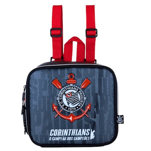 Lancheira escolar do Sport Club Corinthians Paulista, ideal para crianças torcedoras do clube levarem seus lanches para escola com muito estilo. Alças vermelhas ajustáveis, permitindo que a lancheira seja usada como mochila ou acoplada á mochila de rodinhas (provavelmente da mesma linha). Com frente em poliéster com patch e espuma. Sublimação na parte frontal. Além disso, os puxadores emborrachados personalizados garantem um toque divertido e facilitam o uso no dia a dia. Cor predominante: preto e cinza, com detalhes em vermelho e branco. Estampa exclusiva do time, zíper duas cores. Produzida com materiais resistentes e acabamento de qualidade, durabilidade garantida. Forro da lancheira é ideal para conservar alimentos e bebidas na temperatura adequada. Bolso para alimentos e bebidas.