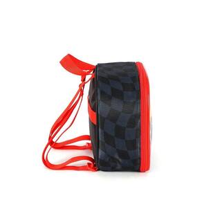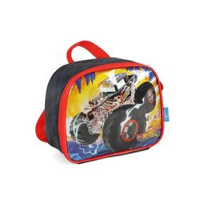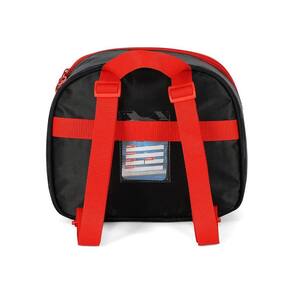 Lancheira térmica com estampa frontal, alça de mão, alça de costas reguláveis, fechamento em zíper e etiquetas personalizadas.