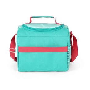 Lancheira térmica com estampa frontal, alça de mão, alça de costas reguláveis, fechamento em zíper e etiquetas personalizadas.