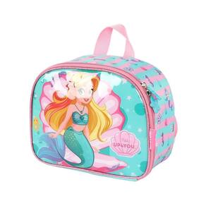 Lancheira térmica com estampa frontal, alça de mão, alça de costas reguláveis, fechamento em zíper e etiquetas personalizadas.
