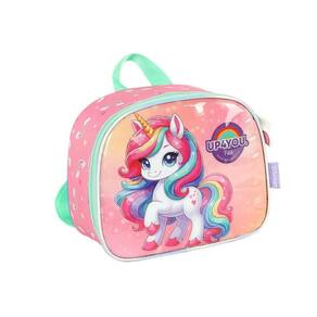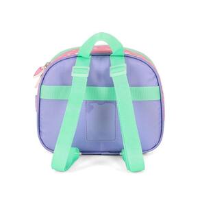 Lancheira térmica com estampa frontal, alça de mão, alça de costas reguláveis, fechamento em zíper e etiquetas personalizadas.