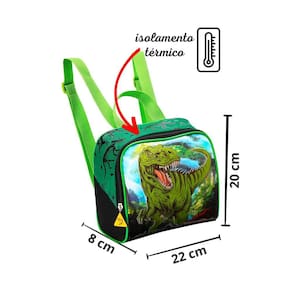 Lancheira Escolar Térmica Dinossauro Produzido em poliéster Possui alças de costas Material interno térmico Ziperes com puxadores personalizados Estampa estilizada Não acompanha potinho e garrafinha Dimensões: 22 x 20 x 8cm alt x larg x prof ; Ean: 7899310513934