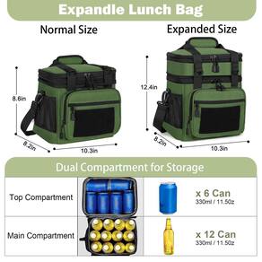 Apresentamos a lancheira GLENKEY com isolamento duplo, um suporte de refeição versátil e durável projetado para adultos. Esta bolsa verde militar, com seu tema militar, é perfeita para trabalho, passeios, piqueniques, acampamento e viagens rodoviárias. Tem uma grande capacidade de 12 L, expansível até 16 L, e pode armazenar até 20 latas de refrigerante, o que a torna ideal para longos dias fora. A lancheira possui ótimo desempenho de isolamento, mantendo sua comida fria ou aquecida por até 8 horas, e é resistente à água e à prova de vazamentos, garantindo que seus pertences estejam protegidos. A lancheira GLENKEY também oferece 5 bolsos versáteis para facilitar o armazenamento de seus itens essenciais e um grande adesivo de fecho aderente na frente para personalização. Ela vem com uma alça de ombro ajustável e é coberta por uma garantia especial de 18 meses para qualquer problema de qualidade. A bolsa mede aproximadamente 25,4 x 18 x 30,5 cm e deve ser lavada à mão para cuidados. - Grande capacidade com design expansível - serve para 20 latas de refrigerante (350 ml). Compartimentos duplos para diferentes usos, o compartimento superior da lancheira feminina é expansível, aumentando a capacidade em 4L. Tamanho normal com 12 L. Útil para usar no trabalho, passeios, piqueniques, acampamentos, viagens rodoviárias e assim por diante. - Ótimo desempenho de isolamento - O forro de isolamento de 6 mm de espessura ajuda a manter sua comida fria ou quente na temperatura certa por até 8 horas. Alimentos que precisam ser mantidos separados de molhados e secos podem ser armazenados nos compartimentos superior e inferior. - Resistente à água e à prova de vazamento - O tecido externo é feito de material durável resistente à água e resistente ao desgaste, protegendo seu almoço e coisas internas de pouca água ou chuva. Em comparação com outras lancheiras femininas, nossas lancheiras grandes podem suportar até 10 kg! O forro espesso e o processo de prensagem térmica one-peace garantem que não haja vazamentos e são fáceis de limpar. - Estilo Tactiacl e multiuso - um grande adesivo de fecho aderente na frente você pode adicionar um adesivo para personalizar sua lancheira. 5 bolsos versáteis na lateral projetados para armazenar celular, carregador portátil, carteira, chaves, cartão, lenço de papel, garrafa, bebidas e muito mais! 2 fivelas de metal para pendurar chaves, cosméticos e outros pequenos itens essenciais. - Garantia de 18 meses - As lancheiras GLENKEY são cobertas pela garantia especial de 18 meses para qualquer problema de qualidade. a qualquer momento se houver alguma dúvida ou preocupação!