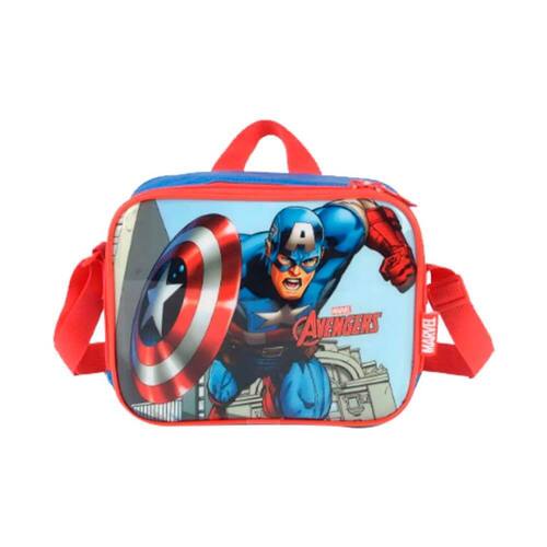 Lancheira térmica infantil Avengers. Lancheira qualidade confeccionada em poliéster, fechamento em zípper. Lancheira com alça de mão, alça tiracolo, revestimento interno térmico e etiqueta de identificação.