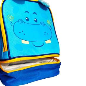 - cor azul. - designer personalizado com orelhinhas de animal. - possui 2 compartimentos. - 2 zíperes de patinhas. - alça costas reguláveis. - alça traseira para acoplar a mochila. - 1 alça de punho. - com revestimento interno térmico para conservar bebidas e lanches por muito mais tempo. - 100% poliéster.