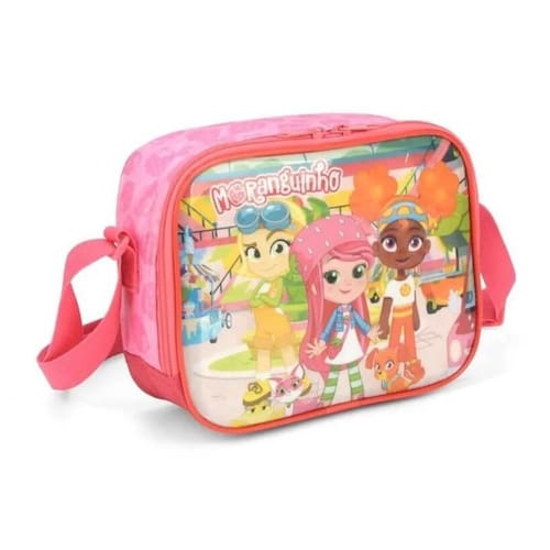 Lancheira térmica infantil Moranguinho. lancheira qualidade confeccionada em poliéster, fechamento em zípper. lancheira com alça de mão, alça tiracolo, revestimento interno térmico e etiqueta de identificação.