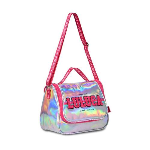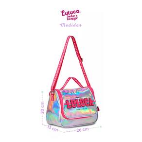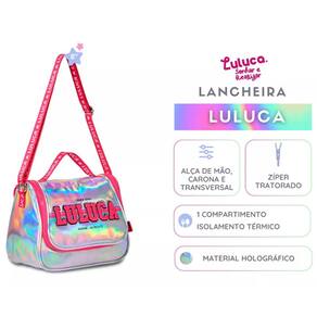 Marca: Clio Style Youtuber: Luluca Material: PVC Holográfico Possui um compartimento; Alça transversal regulável; Alça carona, para acoplar na mochila de carrinho; Alça de mão; Possui isolamento térmico; Zíper tratorado.