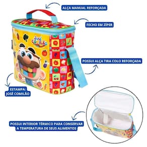 Lancheira térmica Dermiwill, para que você possa levá-la para qualquer lugar. Conta com estampa personalizada, alça de ombro regulável removível e multiuso. Alça de mão com engaste. Possui elástico interno e na parte de trás.