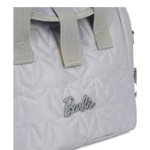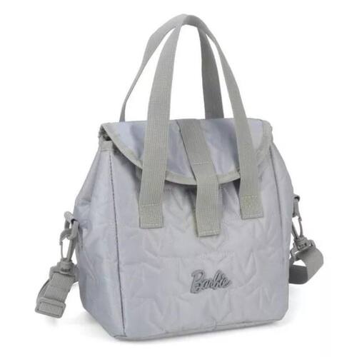 Esta lancheira oferece um design sofisticado e prático, disponível em cores rosa ou cinza, com acabamento em matelassê que adiciona um toque clássico, enquanto o logo da Barbie, sutilmente incorporado, celebra a marca.