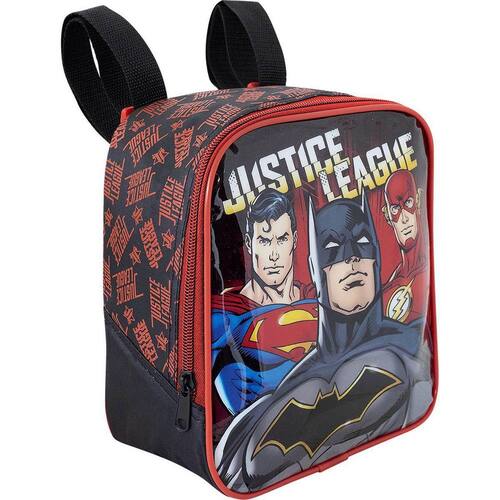 Linha X1/21 de Liga da Justiça. Lancheira com compartimento espaçoso forrada internamente com material que ajuda a manter o frescor dos alimentos por mais tempo. Fechamento em zíper. Alças reguláveis. Produto certificado.