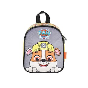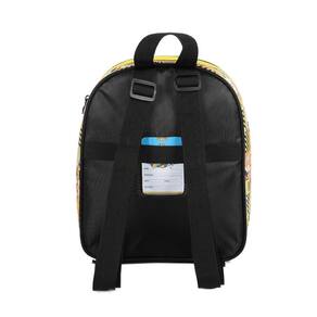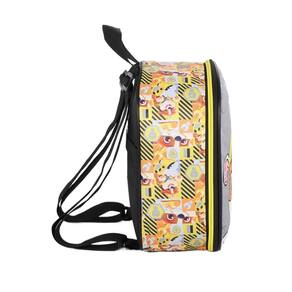 Lancheira térmica com estampa frontal, alça de mão, alça de costas reguláveis, fechamento em zíper e etiquetas personalizadas.