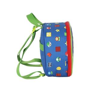 Lancheira térmica com estampa frontal, alça de mão, alça de costas reguláveis, fechamento em zíper e etiquetas personalizadas.