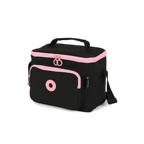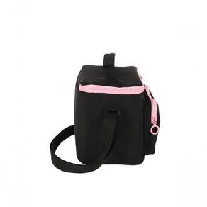 A lancheira é confeccionada em algodão, material leve, e possui bolso frontal e abertura superior, facilitando o acesso interno. O design com logo em metal, alça de mão e alça transversal ajustável conferem praticidade e conforto no transporte.