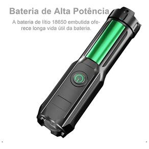 Potência luminosa: até 800 lúmens Tipo de LED: COB de alto brilho Temperatura de cor: 6000K (luz branca) Bateria: 18650 recarregável (inclusa), 800 mAh Carregamento: via cabo USB (incluso) Tempo de recarga: aproximadamente 3,5 horas Indicador de carga: vermelho (carregando) / azul (carga completa) Dimensões: 13 a 15 cm (comprimento, conforme ajuste do zoom) x 3,5 a 5 cm (diâmetro) Peso: aproximadamente 90 g Recursos: zoom telescópico, corpo retrátil, design compacto