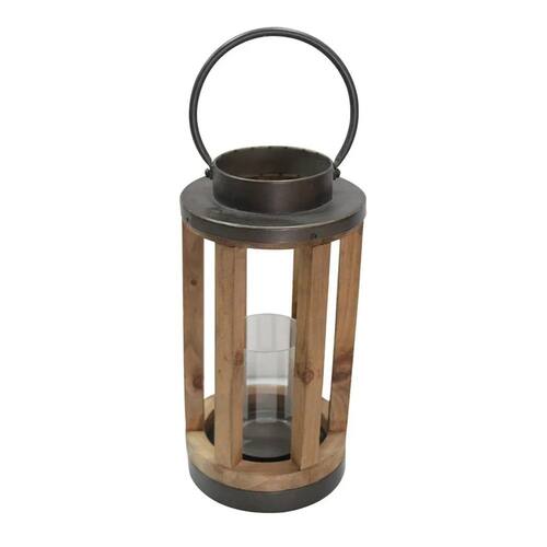 A lanterna decorativa em metal e madeira marrom é a peça ideal para quem deseja adicionar um toque rústico e acolhedor à decoração. Seu design combina estrutura metálica com detalhes em madeira, criando um visual elegante e natural.