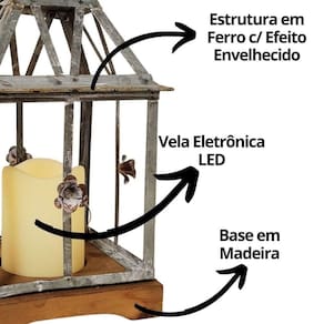 Com 28cm de altura x 16cm de largura, a lanterna acompanha vela eletrônica LED de 10cm x 7,5cm, que oferece uma iluminação suave e realista, sem os riscos da chama aberta. Alimentada por 3 pilhas AAA (não inclusas), a vela é prática e segura para uso interno. O modelo conta ainda com argola metálica para pendurar, permitindo variações criativas na ambientação.