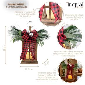 Lanterna Decorativa Natal Laço Xadrez Madeira Vela Led 38cm Lanterna Decorativa de Madeira com LED e Festões de Natal Inigual Decor Ilumine seu ambiente com um toque de charme rústico, aconchego e estilo com esta Lanterna Decorativa de Natal da Inigual Decor. Perfeita para criar um clima festivo e acolhedor em qualquer canto da casa, ela combina a beleza natural da madeira com a magia dos enfeites natalinos. Confeccionada em madeira vazada, a lanterna possui um design clássico e elegante. No interior, uma vela de LED emite uma luz suave e segura, proporcionando um brilho quente sem os riscos de uma chama real. A decoração do topo é o toque especial: um laço de tecido xadrez nas cores vermelho e preto, complementado por folhagens verdes e bolas prateadas. É uma peça completa e pronta para embelezar sua sala de estar, hall de entrada ou qualquer outro espaço. É a escolha perfeita para quem busca um item de decoração que une funcionalidade, segurança e um design festivo e autêntico. Por Que Escolher a Lanterna Inigual Decor Design Aconchegante: A combinação de madeira e decorações natalinas cria uma atmosfera calorosa. Vela de LED Segura: A iluminação por LED é ideal para lares com crianças e animais de estimação. Detalhes Ricos: O laço de tecido e os festões dão um toque final de elegância e festa. Versatilidade: pode ser Utilizado em mesas, aparadores ou pendurada pela alça. Especificações do Produto: Altura Aproximada: 38,0 cm Com alça 42,0 cm Largura Aproximada: 17,5 cm Com folhagem 36,0 cm Profundidade Aproximada: 15,0 cm Peso Aproximado: 655 g Material: Madeira, Plástico, Tecido e Metal Cor: Marrom, vermelho, preto, verde e prata Conteúdo da Embalagem: 1 Lanterna Decorativa com Vela de LED Alimentação: 3 Pilhas AAA não inclusas Observação: As imagens são ilustrativas. Itens decorativos adicionais exibidos nas fotos não acompanham o produto. Vem decorar, seja INIGUAL Marca: Não Informado