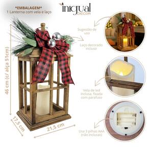 Lanterna Decorativa Natal Laço Xadrez Madeira Vela Led 46cm Lanterna Decorativa de Madeira com LED e Festões de Natal Inigual Decor Ilumine seu ambiente com um toque de charme rústico, aconchego e estilo com esta Lanterna Decorativa de Natal da Inigual Decor. Perfeita para criar um clima festivo e acolhedor em qualquer canto da casa, ela combina a beleza natural da madeira com a magia dos enfeites natalinos. Confeccionada em madeira vazada, a lanterna possui um design clássico e elegante. No interior, uma vela de LED emite uma luz suave e segura, proporcionando um brilho quente sem os riscos de uma chama real. A decoração do topo é o toque especial: um laço de tecido xadrez nas cores vermelho e preto, complementado por folhagens verdes e bolas prateadas. É uma peça completa e pronta para embelezar sua sala de estar, hall de entrada ou qualquer outro espaço. É a escolha perfeita para quem busca um item de decoração que une funcionalidade, segurança e um design festivo e autêntico. Por Que Escolher a Lanterna Inigual Decor Design Aconchegante: A combinação de madeira e decorações natalinas cria uma atmosfera calorosa. Vela de LED Segura: A iluminação por LED é ideal para lares com crianças e animais de estimação. Detalhes Ricos: O laço de tecido e os festões dão um toque final de elegância e festa. Versatilidade: Pode ser Utilizado em mesas, aparadores ou pendurada pela alça. Especificações do Produto: Altura Aproximada: 46,0 cm Com alça 51,0 cm Largura Aproximada: 21,5 cm Com folhagem 36,0 cm Profundidade Aproximada: 17,5 cm Peso Aproximado: 940 g Material: Madeira, Plástico, Tecido e Metal Cor: Marrom, vermelho, preto, verde e prata Conteúdo da Embalagem: 1 Lanterna Decorativa com Vela de LED Alimentação: 3 Pilhas AAA não inclusas Observação: As imagens são ilustrativas. Itens decorativos adicionais exibidos nas fotos não acompanham o produto. Vem decorar, seja INIGUAL Marca: Não Informado