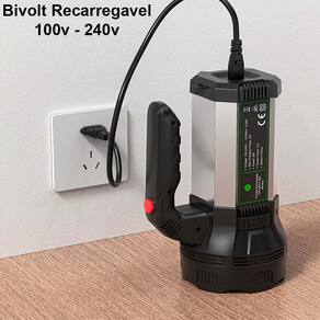 O modelo é bivolt (100–240V), oferecendo praticidade no recarregamento. Conta com 3 modos de operação: luz forte, luz fraca e modo strobo (pisca). O LED de 20W garante boa intensidade e alcance de luz, tornando-a uma ferramenta versátil para diferentes situações.