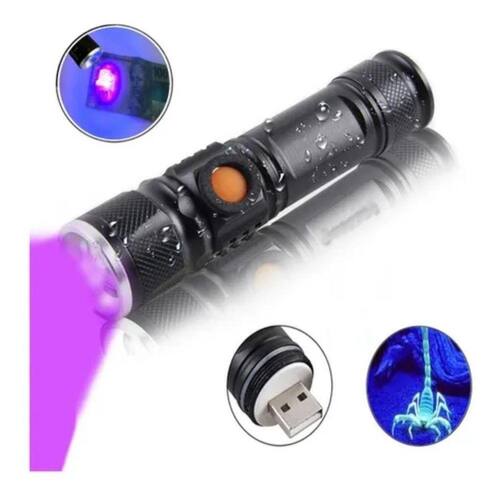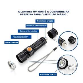 Luz negra Material: alumínio Carregamento via usb Design à prova d'água Zoom ajustável telescópico 2000x Possui 4 modos: forte, fraca, flash e sos Tamanho cm : 11,2 x 2,8 x 2,5 cm Peso: 103g