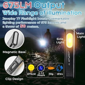 - Brilho de área ampla: a lanterna Jawploy Edição de Bolso contém duas luzes superiores/laterais atingindo brilho de 675LM e alcance de 50 m – seu item essencial para uso ao ar livre. Possui uma base magnética + clipe para fácil montagem/transporte. Funciona muito bem em ambientes internos ou uso diário também