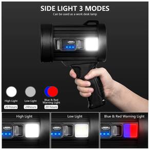 Super Bright Spotlight O chip P90 mais atualizado pode gerar uma saída de luz de até 90.000 lúmens. A distância de irradiação é de cerca de 1640 pés 500m. 6 Modos de luz luz frontal High Meidum Strobe, luz lateral luz de aviso de alta baixa segurança que é um holofote. Você pode usar para diferentes requisitos de iluminação. Várias formas de carregamento O ATTER recarregável de alta capacidade de 9600mAh Permitido que você carregue os holofotes sem gastar dinheiro em baterias. Pode ser recarregado com o cabo USB incluído 4 5 horas ou por energia solar 10 20 horas. IPX5 à prova dágua e adequado para vários ambientes protegidos de respingos de água de todos os ângulos. É adequado para o ambiente ao ar livre, condições climáticas adversas. Feito de liga de alumínio de alta qualidade e material ABS. À prova de derrapagem, à prova de explosão e à prova de choque. Ele tem uma alça grande e confortável, o bastante útil você vai caçar, passear de barco, acampar, passear com cães, explorar cavernas, pesquisar, tempo de passeio e uso doméstico. 4 núcleos e banco de potência 4 modos de luz de cor luz branca alta média estroboscópio, luz azul alta média estroboscópio, luz vermelha alta média estroboscópio e luz amarela alta média estroboscópio Estrobo . Você pode facilmente entre diferentes núcleos de iluminação alternando como os correspondentes. Ele também pode funcionar como um banco de energia portátil para carregar seus dispositivos. As luzes azuis indicam um útil da ATTERY 35,65,100 Marca: Não Informado