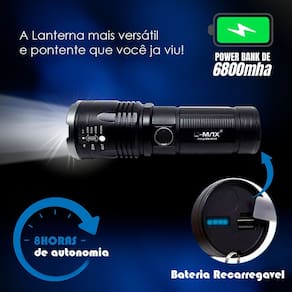Especificações Técnicas: - Brilho: 2000 lumens; - Tipo de bateria: interna recarregável 8000mAh; - Autonomia: até 6 horas de uso contínuo; - Ajuste de foco: x1 a x2000; - Modos de iluminação: forte, média e suave; - Material: alumínio com alta durabilidade; - Cor da luz: branca; - Peso: 348g; - Dimensões: 18,5 cm (C) x 5,5 cm (L).